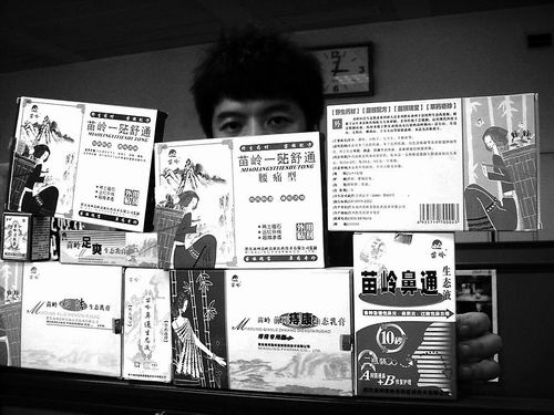 “我有鼻炎,常常鼻塞,有没有什么好药?”记者问。“鼻塞?”营业员从柜台里面又取出一盒药说,“你用苗岭鼻通生态液吧,也是全中药,效果特别好。”