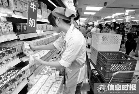 昨日上午,记者先后走访了好又多超市南洲店、百佳超市晓港店以及家乐福超市万国广场店,发现伊利、蒙牛、光明、雀巢等品牌的国产液态奶陆续返市,但原先热卖的1L家庭装液态奶产品却因“销量上不去,不敢订货”而变得稀有,液态奶品种还不足正常时期的一半数量。