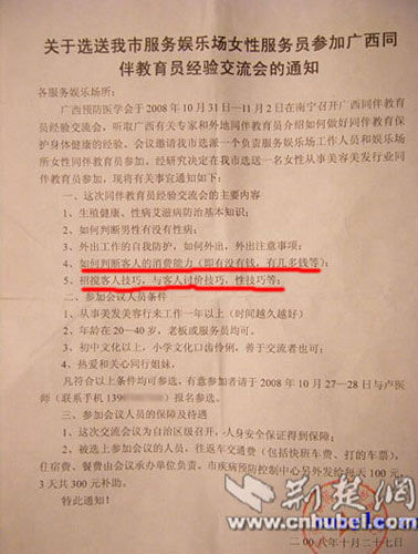 通过“糜瑞兰”上传的宣传单照片,可以很清楚的看到这份全称为《关于选送我市服务娱乐场女性服务员参加广西同伴教育员经验交流会的通知》的宣传单中,抬头为“各服务娱乐场所”,落款为“宜州市疾病预防控制中心”并盖有相应公章,其正文中列明交流会的主要内容包括“……4、如何判断客人的消费能力……5、招揽客人技巧,与客人讨价技巧,性技巧等”。该图文内容随即被多个论坛转载。