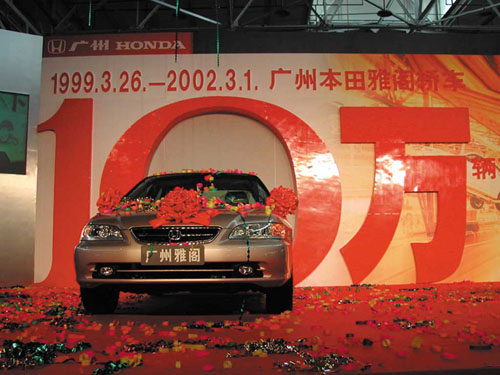 2002年3月1日,广州本田累计生产的第10万辆广州雅阁轿车下线。