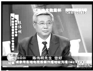在一家电视台播出的亿康纳米能量杯的广告中,一位学者打扮的人端坐当中,文字显示,他叫陈伟明,是中国医促健康饮水协会理事。而在另一幅华佗延寿酒的广告视频截图中,还是那位“陈伟明”,可文字显示其姓名却变成了关新良,身份也变成了《北京中医》杂志编委、中国中西医结合协会理事、北京中日友好医院主任医师。第三幅截图来自天地磁疗仪的电视广告,这个“陈伟明”又成了一名心脏病患者,一脸痛苦表情。