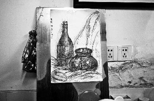 屋里的一面沙发上,还有十多张筱筱画的素描,其中一张素描《瓶子和橙子》摆放在客厅。这张画上的字迹与她写给母亲的遗言条字迹如出一辙。