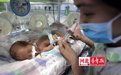 昨日,记者在医院的新生儿监护病房看到,三个小男孩儿都躺在保温箱里。据儿科医生介绍,三个孩子都是低体重早产儿,出生时孕周为33周多。老大是1.58公斤,老二和老三是1.55公斤,自3月16日出生到现在已经度过了呼吸关,还有感染关、喂养关、黄疸关在等待着他们。这两天护士已经开始通过鼻饲管注射给他们喂奶了,三个孩子每次分别给注射7毫升、3毫升和4毫升,2个小时喂一次。从目前来看,除老大有点贫血外,三个孩子心肺功能脑部发育都很好,预计还有2到3周孩子们才能出保温箱。