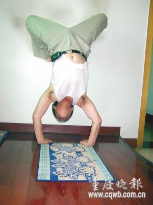 昨晨(7日)8时,重庆南岸区南坪大厦8-3,“倒立式‘俯卧撑’我每天要做几十次,出一身汗舒服,感觉身体轻松不少。”老杨抹了把汗说。汗水已湿透了背心。