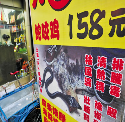 “打死我都不敢吃!”市民刘先生在黄泥塝看到某餐馆推出的“蛇咬鸡”招牌后说,这些吃法太怪了。刘先生介绍,招牌上还说,吃“蛇咬鸡”可以醒脑、除雀斑、排脏毒、祛风湿等。“这不仅太残忍,太血腥,也不道德。”张女士说,希望这仅仅是个别餐馆吸引顾客而搞的噱头。