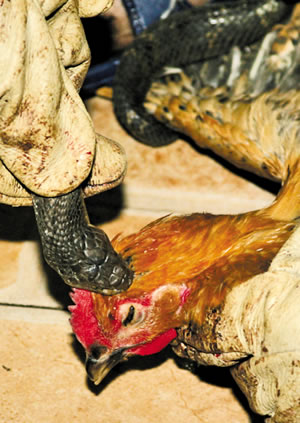 男厨师随即将这条眼镜蛇放回笼中,顺手拿出一条稍大的眼镜蛇。“啪、啪、啪!”男厨师再次拍打它的头部,并将母鸡靠近其芯子“诱惑”它。