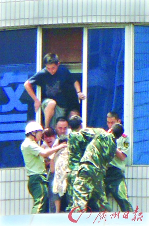 中午12时左右,4名消防官兵突然从另外一边的窗口出现在平台上,由于平台是绕着医院的柱形墙体修建的,挟持人质的女子并没有发现救援的官兵。趁着谈判人员吸引该女子注意力的时候,四名消防官兵慢慢向女子所站的地方接近。