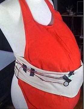 据悉,“怀孕腰带”其实是用装在腰带上的数个传感器追踪孕妇腹中胎儿的一举一动,然后传感器会将电脉冲信号传给“怀孕腰带”上的电子控制器,电子控制器接着会通过无线蓝牙技术,将胎儿的每一个动作信号都发送给计算机,计算机自动将胎儿的动作信号“翻译”成语言张贴到博客网站上,形成胎儿的“博客日记”。