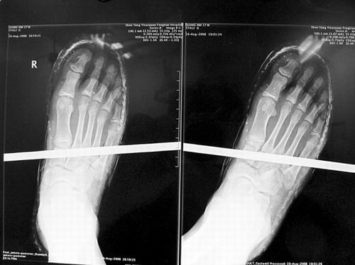 事发时男孩穿着一双布鞋,骨外二科陈宾医生操起剪刀,将布鞋一块块剪掉。经X光透视,医生惊奇地发现:男孩虽然被钢筋穿透了右脚,但骨头、大的血管和神经都没受任何伤害!