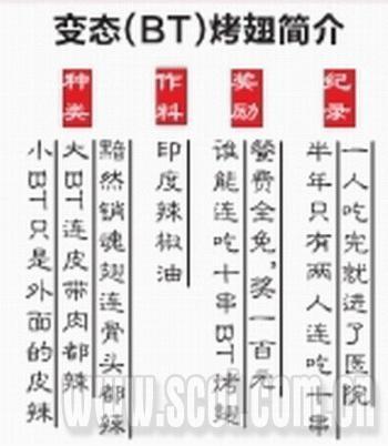 “BT辣就是变态辣。”店主胡先生拿来一份菜单说,“BT烤翅”旁特意写着胆小者勿尝,辣死人他们不负责。据介绍,“BT烤翅”分为大BT和小BT两种,小BT只是外面的皮辣,大BT连皮带肉都辣,至于超级极品——“黯然销魂翅”则连里面的骨头也是辣的。
