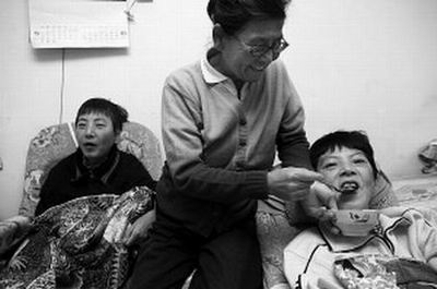 今年71岁的鞠阿姨是从部队退休的老教师,老伴儿也是部队的老干部,他们的两个女儿都患有先天性脑瘫,生活不能自理。多年来,老人一直悉心照顾着一对女儿。2000年老伴儿去世,此后鞠阿姨一个人照顾着两个女儿。现如今,鞠阿姨每天都坚持锻炼,就是希望自己能多活几年好照顾女儿。