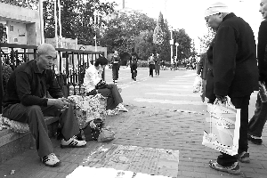 昨日下午,陈松发在人民大学东门旁的便道上乞讨,一名过路的女士掏出420元钱塞进陈松发手中,头也不回地走了。陈松发的弟弟赶紧追了上去。