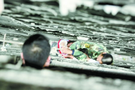 2名消防队员从9楼楼顶放下一根安全绳,娄磊准备把安全绳系到小兰腰部时,小兰不停地哭喊并且扭动着身体,小女孩的身体稍有移动就有坠楼的危险,为了不给小女孩的身体造成二次伤害,娄磊不停地安抚小女孩的情绪。