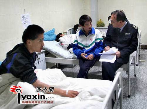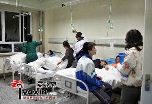 当天22时30分左右,记者赶到救治学生最多的昌吉市人民医院时,只见一楼的两个病房里,每张病床上都躺着一名或是两名学生,他们都在输着液体。而在另外一个输液室里,至少坐着二十名身着校服的学生,他们都在输着液,但从他们的表情看,症状应该较轻。在这些病房的门口,记者发现,每个病房的门口都有一名成年人在把守着,当记者试图想进入病房时,就被这名成年人拦住不让进。并称他们是学生的老师,所以采访他们均不接受。