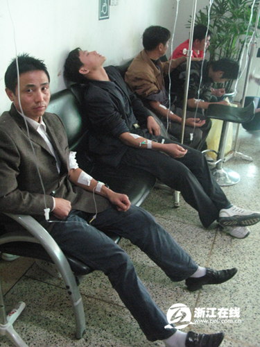11月5日下午,记者在医院急诊中心看到,急诊室的门口坐着5个脸色苍白的男子,都无精打采地挂着吊瓶,其中一个年轻男子把脸埋在一个黄色的塑料袋里不停地呕吐,身边的男子不停地揉着他的背。