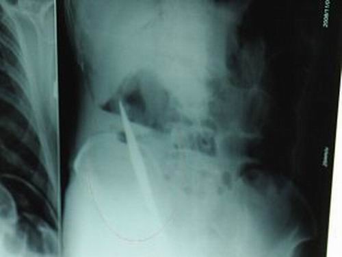 昨天(11月6日)上午,记者在徐州矿务集团总医院重症监护室见到了这名男子,目前他虽然已经恢复了意识,但还不能开口说话,需要呼吸机辅助呼吸。据医生介绍,4日中午12时左右,这名男子因服毒轻生被紧急送到医院进行抢救,之前,这名男子已经在当地乡镇医院进行了近20小时的治疗,但效果不佳。“病人被转院到矿总院时已神志不清,血压极低,处于休克状态。”救护人员给男子洗胃、初步处理以后,发现男子呼吸急促,于是赶紧给他拍片检查。结果让所有的医生大吃一惊,竟有一把尖状异物横在该男子腹腔内!当天下午5时30分,轻生男子被推上了手术台。经过40多分钟的手术,该男子腹腔被打开,手术医生发现,男子体内的金属状异物竟然是一把长19厘米的尖刀!