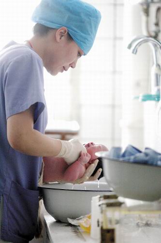 10:00左右,在河北区妇幼保健院的产科病房,多名医护人员正在给这名浑身分不清是粪便还是血迹的婴儿实施抢救。考虑到婴儿吸进了大量屎尿,极容易产生窒息,在医护人员对婴儿口鼻进行仔细清理后,婴儿终于可以大哭了。而此时,一段长约20厘米的脐带还留在婴儿的肚脐处。医护人员将脐带剪断后,紧急进行了消毒处理。她们又找来了沐浴液,足足给婴儿清洗了10分钟,才基本看清了婴儿的模样。