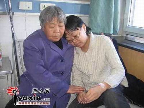 昨日(11月25日),记者在乌鲁木齐第四人民医院见到了26岁的杨丹,她虚弱地靠在妈妈身上,头也抬不起来,面色发白。