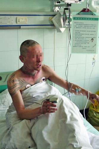 中午12点,济南市中心医院烧伤病房,32岁、胸前文身的萧某一脸痛苦。医生初步检查,他脖子及左手烧伤,幸无生命危险。虽死里逃生,但萧某饱受煎熬。一方面,他对自己的自焚行为不后悔,“我该死!如果我死了,家里还能有点抚恤金”;可另一方面,他几度落泪,“点火瞬间,我想起了家人。”