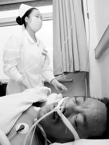 1日夜里,患者病情突然加重,医护人员立即投入紧急抢救,再次将濒危的患者从死亡线上拉回来。不久,患者出现精神躁动,意识混乱的他竟挣脱护士的双手,自己拔掉输液管,生命监护仪上,他的血压、心跳再次异常……