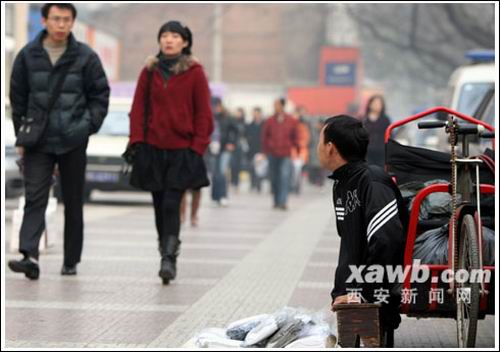 “袜子10块钱4双,大家来看看。”昨日(12月18日)下午3时许,在东大街上,寻常的叫卖声中,一个小贩坐在小木凳上,身着破旧的运动服,面前是一个小地摊,放着各色各样的新袜子。他的身体倚着一辆手摇车,面带微笑地望着过往行人。
