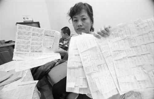 为给明明治病,一家人四处奔波,攒下一堆票据。 记者 朴峰 摄