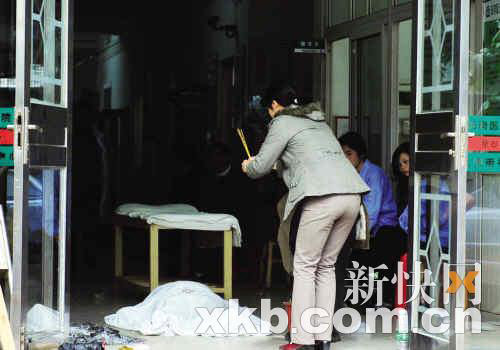 前日上午11时,记者在事发医院看到,医院门口拉起警戒线,两名警察在维持秩序。医院楼前堆放着一些桌椅,门前撒了一地纸屑。门诊大厅的过道上听放着死者遗体,一名妇女在旁焚纸烧香,厅内还有不少人聚集,哭声阵阵。