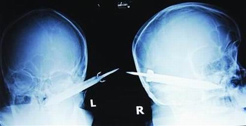 经过检查,医生说这把长有10厘米左右的刀,从右耳窝上前方直接刺进了鼻腔,离颌内大动脉很近,刀卡在了骨头中,要取出这把刀最怕大出血,万幸的是这把三棱刀并没有伤及大脑。