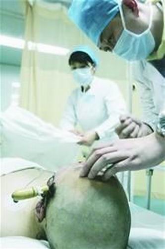 昨晚7时40分,刚被推出CT检查室的文文,已被剃光了头,头上的黄色木刀把在灯光下反光。嘴巴、鼻子周围的血已经凝固。