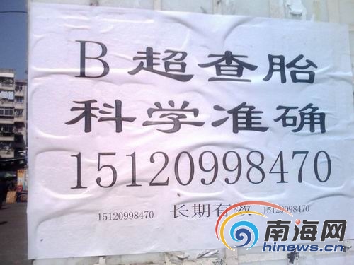 “只要你愿意花800元,肚子里怀的是男是女,一查便知!”连日来在海口的大街小巷内,出现了很多类似的广告。那么,这一明显违反国家规定的行为究竟是怎么回事呢?1月13日至1月14日,记者连续两天进行暗访,一探究竟。