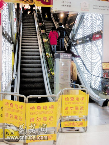 昨日下午两时许,记者来到该商场的一楼,看到左侧的自动扶梯已暂停运行,正在维修。