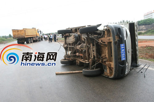 2月18日上午9时50分左右,海口绕城高速公路与海榆中线8公里处发生一起车祸。工程车与小货车相撞,小货车侧翻,一名男子卡在副驾驶室里,现已被送海南省人民医院抢救。