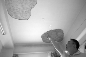 就在记者了解情况过程中,侯女士不断出现恶心、呕吐等症状。“这房子也太不结实了,去年10月份卧室靠近窗户的天棚就掉了一块墙皮,好在家里没人,后来我们自己用水泥抹了一下。”当天,倪先生找到了负责小区开发的哈尔滨新阳开发公司,但等了3个多小时也没见到相关负责人。