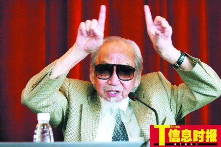 96岁高龄的文怀沙戴着盖着半张脸的大墨镜,流着长胡子,好似老顽童,他要主持人介绍他为“青年诗人”,赤子之心让全场鼓掌。“中国当代诗人、文人要继往开来,但不能继随地吐痰之往,不能开艾滋病之来。”文怀沙一开口就逗笑全场,文老把他对中华诗坛的理想状态总结为4个字,奇光异彩,“奇光之往应继,异彩之来待开。”