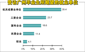 零点调查于今年4月对广州317名应届生进行了访问,调查显示,广州多数大学毕业生希望能找到一份工作稳定、收入高、工作条件和福利待遇好且个人升迁发展前景好的工作岗位。因此,科研机构、党政机关的职业就成为毕业生最理想就业选择。调查结果显示,有近四成的受访应届毕业生希望能够进入机关或事业单位任职,23.7%希望在三资企业中工作。