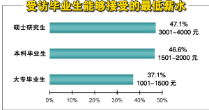 在本次调查中,广州应届毕业生对自己能够接受的第一份工作的最低薪水也进行了估计。46.6%的硕士研究生能够接受2001元~4000元的最低薪金范围,47.1%的本科生能够接受1501元~2000元的最低薪金范围,而37.1%的大专生能够接受1001元~1500元的最低薪金。(周芳、赵媛媛)