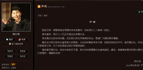 北京电视台文艺频道栏目《星夜故事秀》,前晚照常上演,但已不见主播何云伟、李菁的身影,节目形式也由此前的脱口秀变为歌曲综艺串烧。这样的改动究竟是特别编排,还是突发调整,节目制片人未作表态。李菁随后表示:“节目上个月录过了,怎么播是电视台的事,看他们的安排。”他同时承认,近期没接到北京台邀他再去录节目的通知。