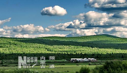 蓝天白云掩映的内蒙古大兴安岭柴河山间(7月2日摄)。