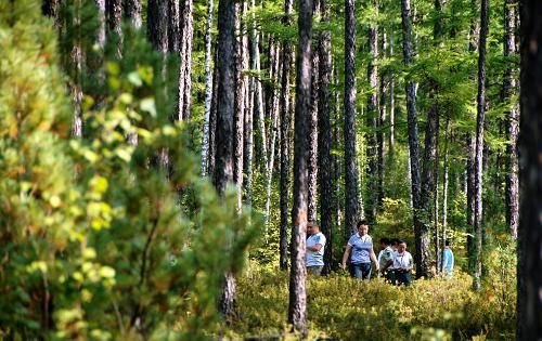 游客在内蒙古大兴安岭红花尔基森林游览(6月16日摄)。新华社记者李欣摄