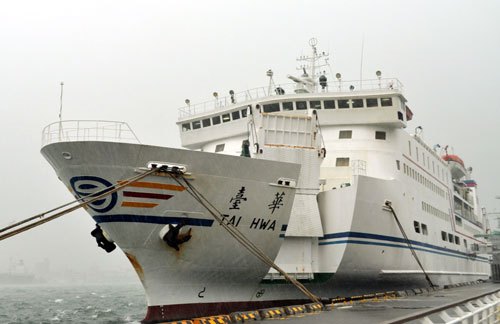 受台风“莱罗克”来袭影响,行驶高雄与澎湖间的台华轮1日停驶,泊靠高雄港。 图片来源:“中央社”