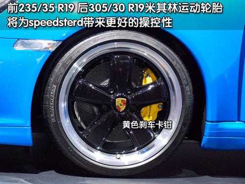 为了适应speedster强大的运动能力,保时捷为speedster准备了前235/35 R19,后305/30 R19大尺寸米其林运动轮胎。轮毂则配备了造型干练的五幅式宽条纹黑色轮毂,刹车卡钳也由经典的保时捷红色卡钳,换为与蓝色车身颜色搭配效果更好的黄色卡钳,其制动能力也比前者有不少提升。