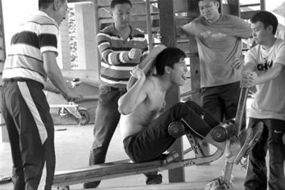 而刘翔的热身也是慢跑和牵拉,这是他抵达广州后的第一堂训练课,师傅孙海平安排的内容是调整训练,练力量。几组双臂单举后,刘翔已经汗流浃背,于是他干脆脱下了上身的T恤。 “昨天在上海还很冷,现在已经热得我想喝冰水了。 ”接着,刘翔又仰卧在训练器材上,进行负重式仰卧起坐,做了三组再换花样。因为器材不顺手,刘翔的手还磨破了,基地一位教练过来问好,顺便关心刘翔现在的手推力量可以达到多少。 “120多公斤吧,现在也差不多。”孙海平答道。没想到刘翔有意见了:“哪止啊,最高的时候可以到130公斤,师傅,你忘记了啊?其实啊,不一定是推得多就说明什么,关键是力量用得到就行了……”