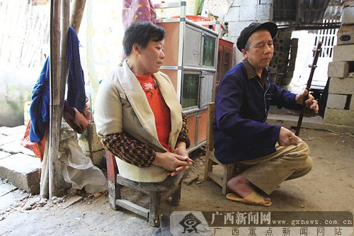 12月5日上午,当记者来到韦家时,韦伯仁夫妻俩正在建新房的楼顶,与前来帮忙建房的乡亲们聊天。听闻记者来到,在蓝彩荣的指引下,夫妇俩从房顶上走了下来。招呼记者坐下后,蓝彩荣唤来二女儿韦艳福为建房的乡亲们烧水做饭,韦伯仁则拿起已经非常陈旧的二胡,拉上一曲。