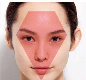 选择中度遮瑕效果、略带光泽感、保湿性高的粉底液,将粉底上在脸部中心钻石区,达到最佳修饰度,兼具自然妆感。