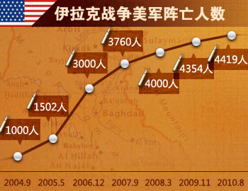 在攻打伊拉克的大规模军事行动中,美军只有138名军人丧生。但此后美军频繁遭到伊拉克境内反美武装的袭击,伤亡人数不断攀升。截至2010年8月16日,驻伊美军死亡总数已达4415人,另有约3.2万人在战斗中受伤。庞大的军费开支也给美国经济造成沉重负担。截至2010年8月19日,美国用于伊战的开支已达7423亿美元,平均每天耗费2.75亿美元。
