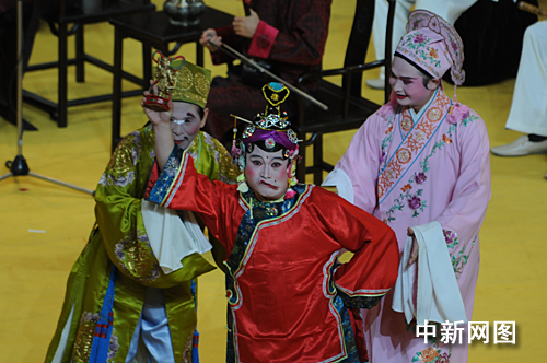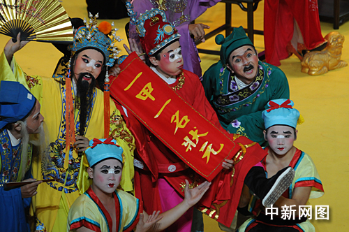 图为闽南特色节目“南音交响”。南音和梨园戏、莆仙戏、高甲戏等南戏被称为“闽南活化石”。舞蹈表演荟萃了南戏梅花奖演员和高甲群丑的精湛表演。