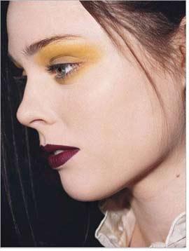金色作为了很多秀场妆容中的柔软部分的选择效果。Roberto Cavalli和Oscar de la Renta选用了镀金的唇色和古铜金的眼影。而Alexander McQueen则选择来在脸颊上打上一抹铜金色,“靠微弱的金色,让皮肤更加闪光”,我们的造型师说。