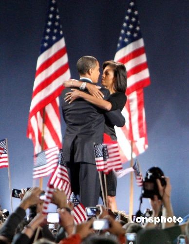 图为奥巴马当晚在芝加哥与妻子米歇尔相拥庆祝胜利。