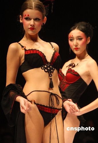 中国国际时装周2009春夏系列发布在北京开幕。11月5日,中国国际时装周(2009春夏系列发布)在北京隆重开幕,来自国内外的40多个知名品牌和时装设计师以及150余位设计新人、时尚之星将在为期一周的时间里在北京饭店和D-PARK北京时尚设计广场举办时装发布、专项大赛、时尚论坛、新闻发布、专题讲座、展览展示等近70项活动。本届时装周发布的品牌和设计师主要来自国内和港、台地区,另有2家韩国品牌和设计师参与。时装周期间将举办45场动态发布活动,其中,有36场时装、成衣、化妆造型设计2009春夏系列趋势发布。图为开幕式上的内衣创新元素设计大赛。