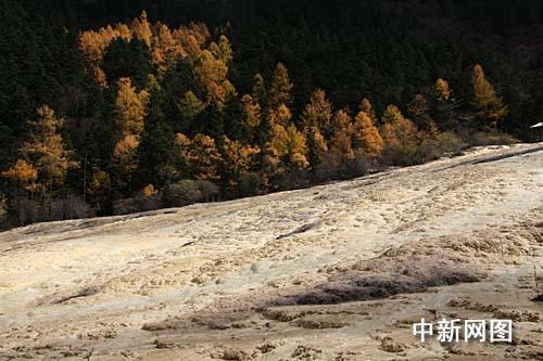 黄龙沟几乎全被乳黄色的碳酸钙质覆盖